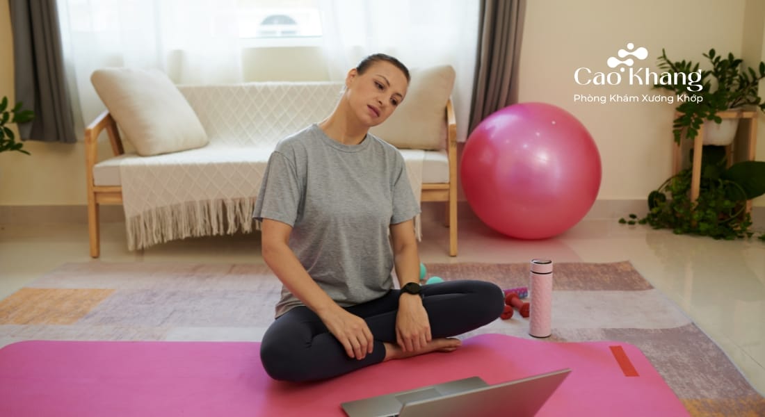 Lưu ý: Không xoay quá nhanh hoặc vượt giới hạn khiến cổ đau nhói. Nếu cảm thấy chóng mặt, nên tạm dừng.